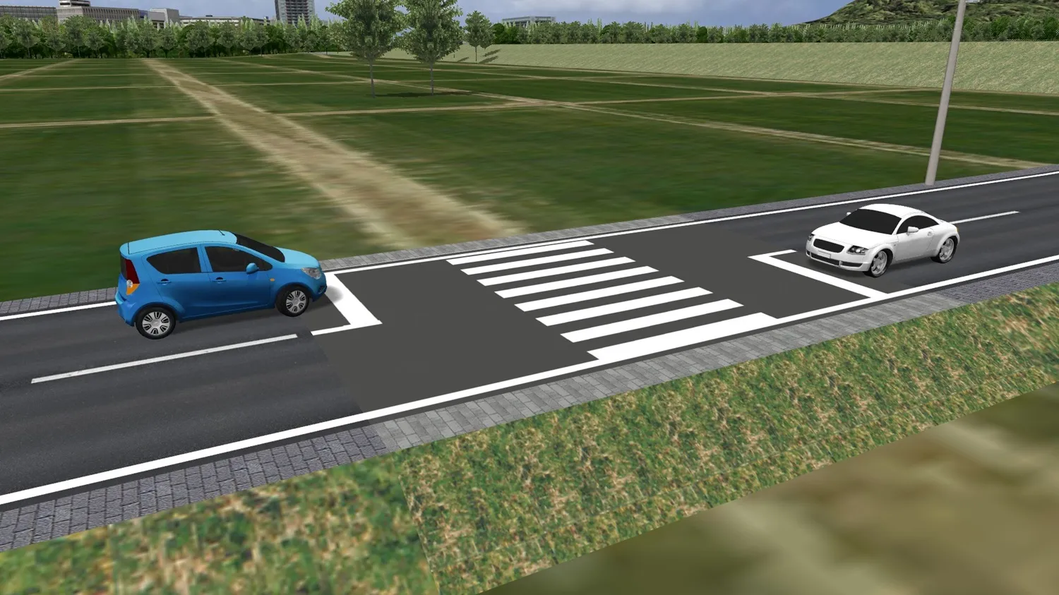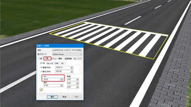 水面やゼブラ、敷地モデルなどで、近くで見ると綺麗だけど上空から見るとちらつくという場合があります。元の地面や道路面と上に配置したモデルとの高さが近い場合に発生します。高さの差を大きくすればちらつきが軽減されますが、近くで見る場合は高さが近いほうが自然に見えます。