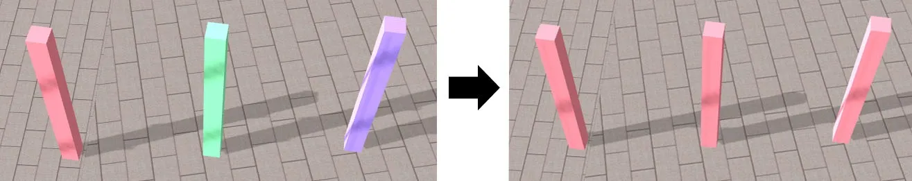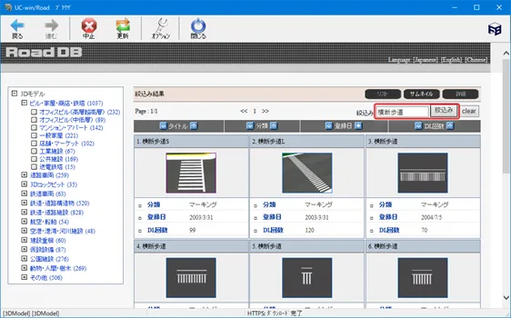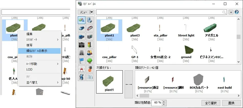 道路付属物で配置したモデル、標識、樹木、マーキングについて、後から配置物を入れ替えることが可能です。メニュー「編集」-「道路付属物」の一覧表の画面で変更したい配置物を選択して「モデルの変更」をクリックします。配置したいモデルまたは樹木等を選択して「確定」すると、入れ替わります。複数選択しての一括変更も可能です。また、配置物を選択して「編集」画面で配置物を変更することもできます。