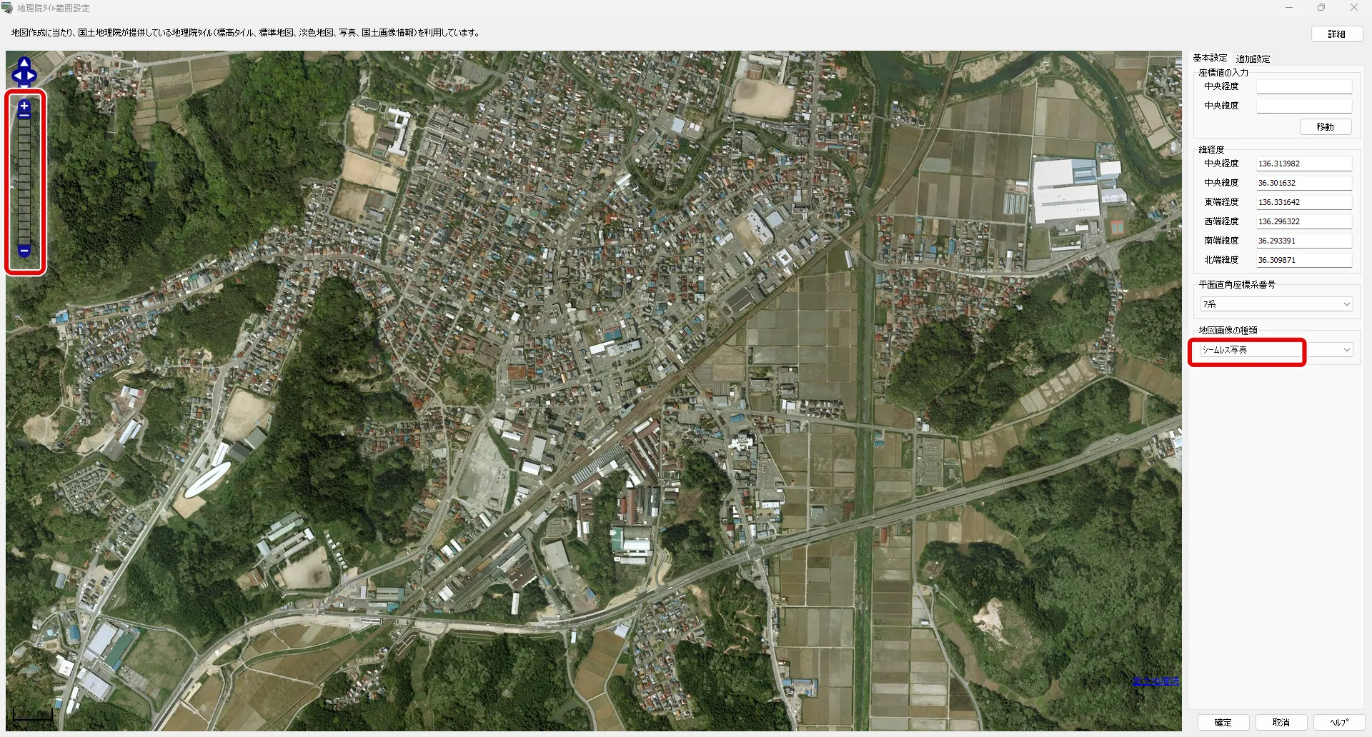 マウスのドラッグで位置を移動、左上のズームレベルやマウスのホイールで拡大縮小して、シミュレーション対象地域を表示します。ウィンドウに表示されている範囲と画像がそのまま地形データとして読み込まれるため、ウィンドウのサイズを変更したり最大化したりして、必要な範囲を選定します。右下の「地図画像の種類」を「シームレス写真」にすると航空写真が表示されます。