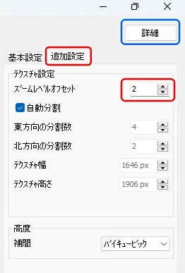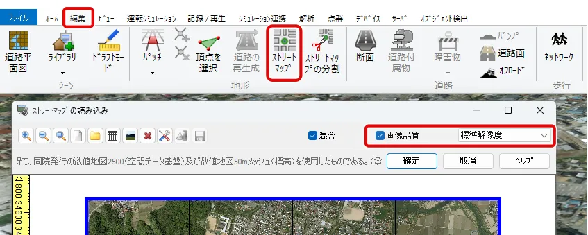 読み込んだ地形データを見て航空写真が粗い場合は、画像解像度を調整することができます。