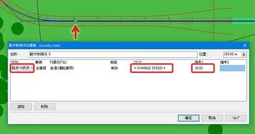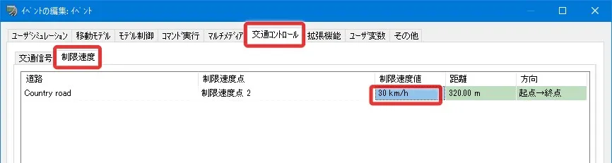 動作制御点により、道路区間毎に制限速度を設定することができます。メニュー「ホーム」または「編集」の「道路平面図」を開き、設定したい道路の平面線形上で右クリック-「追加」-「動作制御点」を指定します。「動作制御点の編集」画面でコマンド「CHANGE SPEED」を指定し、位置、方向、速度を編集することができます。動作制御点を設定すると線形上に黄緑色の点で表示されます。