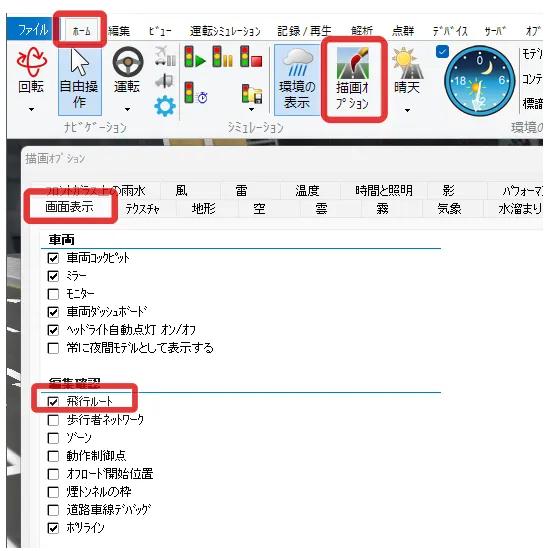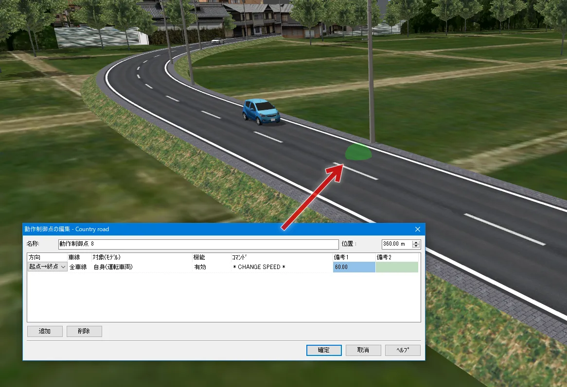 制限速度点でも速度を設定できますが、動作制御点で設定した場合は、道路平面図を開かずにメイン画面で位置や速度を調整することが可能です。メニュー「ホーム」-「描画オプション」の「画面表示」で「動作制御点」にチェックを付けるとVR空間内に緑色の球として表示されます。クリックすると編集画面が開きます。