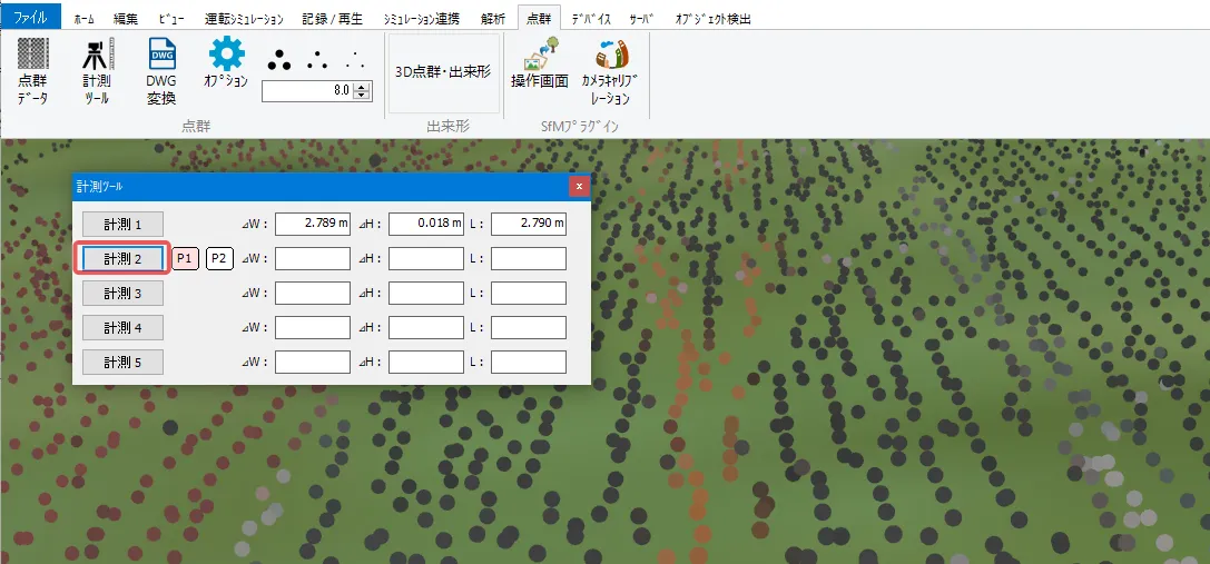 読み込んだ点群データの2点間の距離や高さを計測したい場合、点群メニューの計測ツールを使用します。メニュー「点群」の「計測ツール」で計測ツール画面を開きます。計測したい点群の点を2点選択すると、水平距離、垂直距離、2点間距離の3つの数値が表示されます。1点目を待っている間は[P1]が赤く表示されます。1点目を選択後、2点目を待機中の間は[P2]が赤く表示されます。