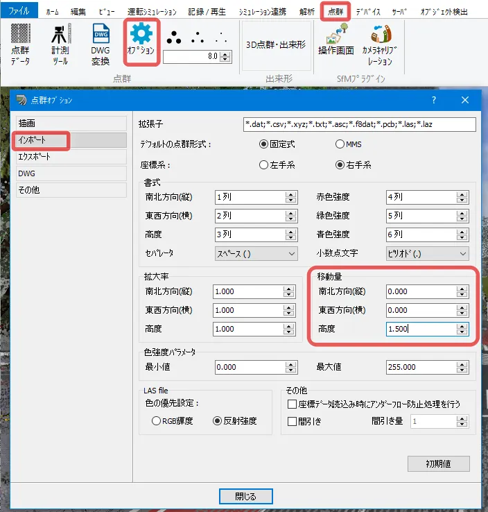 読み込んだ点群に色が表示されない場合、データの色強度情報がパラメータ設定値の範囲外になっている可能性があります。テキスト形式の点群データの場合は、メニュー「点群」-「オプション」-「インポート」のRGB情報(赤色強度/緑色強度/青色強度)の列を適切に設定します。LAS形式のデータの場合は、RGBの列の設定は不要で、「LAS file」の「色の優先設定」を「RGB輝度」にします 。