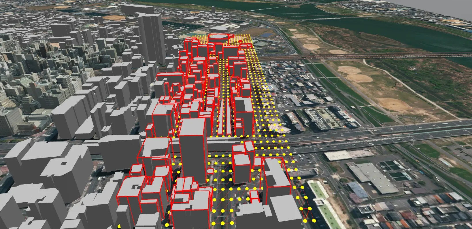 国土交通省整備による3D都市モデルプロジェクト PLATEAU(プラトー)のCityGML形式モデルを読み込んだ後、不要な範囲のモデルを一括で削除する方法があります。地形上のオブジェクト選択を使用します。