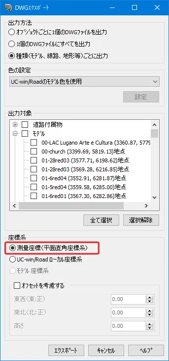 まず、UC-win/Roadから出力する場合は、メニュー「ファイル」-「エクスポート」で3DSモデルやFBXモデルを選択できますが、その際、「X-Y座標系」を指定して出力します。DWGモデルをエクスポートする場合は「測量座標(平面直角座標系)」で出力します。