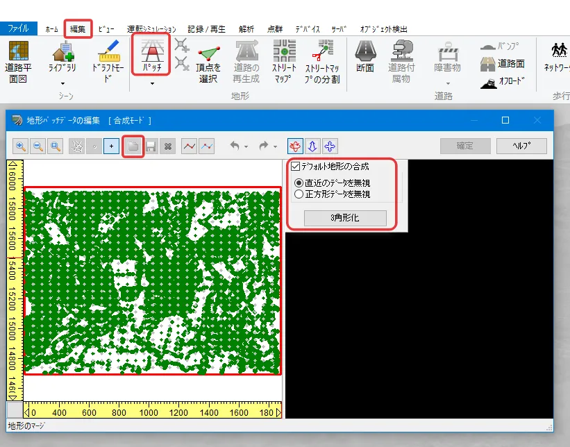 元の地形データに詳細な地形パッチデータを読み込んで合成する際、2つのデータを最適化するため「直近のデータを無視」か「正方形データを無視」かの選択肢があります。ほとんどの場合は「直近のデータを無視」を選択して「3角形化」を行います。
