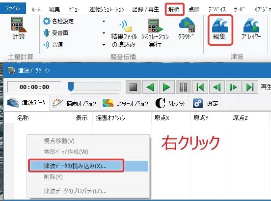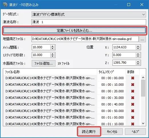 次に、「津波プラグイン」で、ダウンロードしたデータを読み込みます。メニュー「解析」-「津波」-「編集」で「津波プラグイン」画面を開きます。「津波データ」タブで右クリック、「津波データの読み込み」を選択します。「定義ファイルを読み込む」ボタンで先にダウンロードして保存しておいた定義ファイルを指定します。「読込実行」ボタンでデータが読み込まれます。
