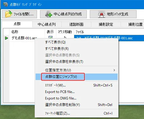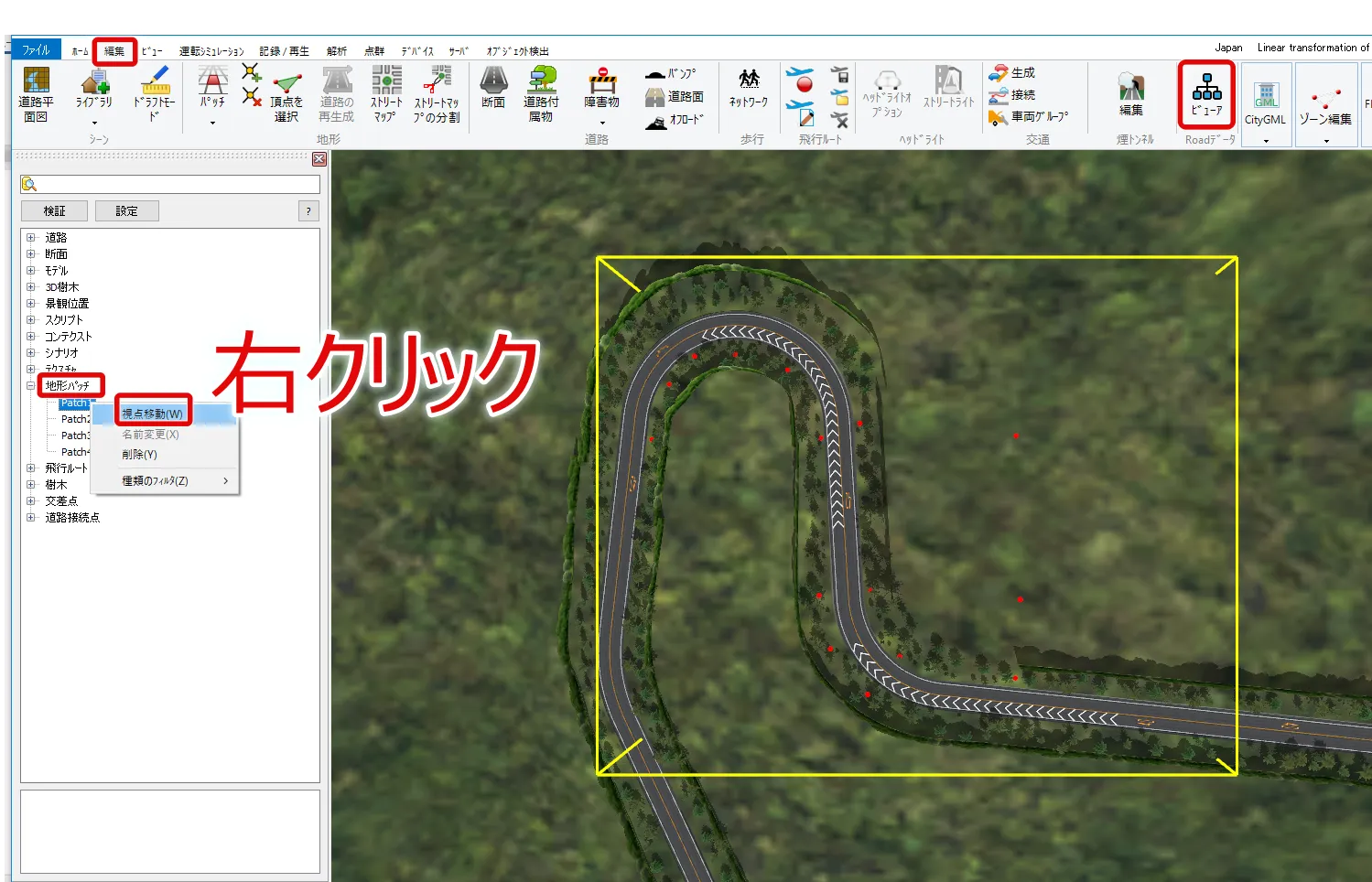 地形パッチの読み込み手順は、メニュー「編集」-「パッチ」で地形パッチデータの編集画面を開き、「地形パッチの読み込み」でパッチデータを読み込みます。この地形パッチデータはUC-win/Road独自の形式となります。