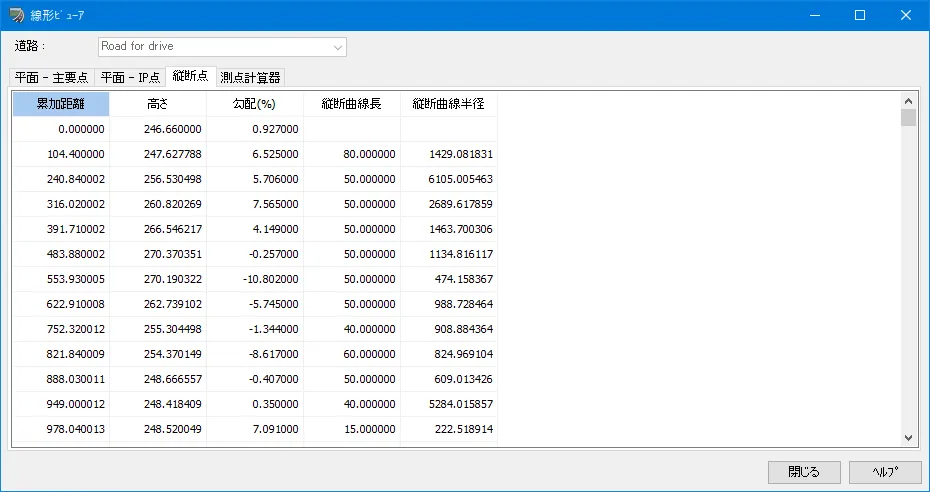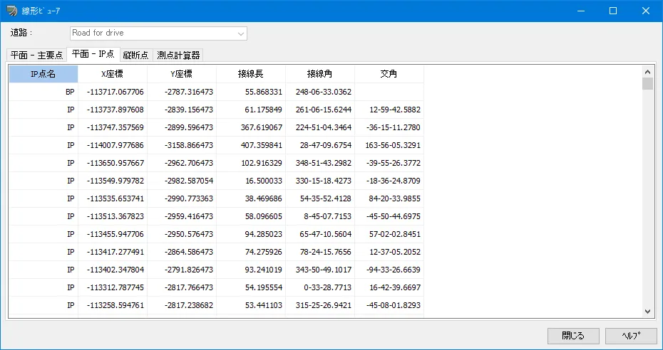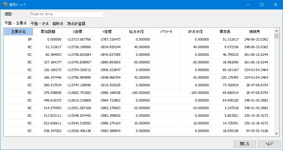 「平面-主要点」では、道路の場合BP、EP、BC、EC、KA、KEを、鉄道の場合BP、EP、BC、EC、BCC、ECC、BTC、ETC、BIT、 EIT、JTCを表示します。