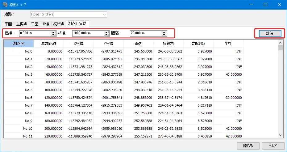 「測点計算器」では、計算したい開始距離と終了距離、測点間隔を入力して [計算]ボタンを押下すると計算結果が表示されます。