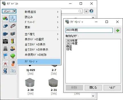 設定するには、まずタグの作成を行います。モデルパネルのメニューで「タグマネージャ」を選択し、タグの名称を入力して「+」ボタンを押すと、有効なタグとして追加されます。次に、タグを各モデルに割り当てます。割り当てるモデルのサムネイルを右クリックし、「タグ」の項目で一覧から割り当てるタグを選択します。1つのモデルに対して複数のタグを割り当てることもできます。