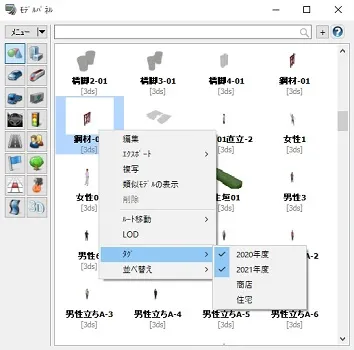 モデルパネル内に表示されるモデルに対して、タグを追加することができます。タグを付けることによって、モデルの絞り込みを行う際にタイプごとの分類よりもさらに細かい分類を独自に作成することができます。この機能を使用すると、例えば建物モデルに対して住宅や商店など用途ごとの分類を作成したり、作業工程の表現を行う場合などに工程や時期ごとにモデルを分類するといった使い方ができます。
