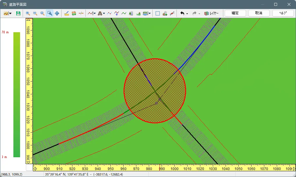 道路の平面線形に赤い×印(バツ、X)がつく場合は、方向変化点の座標と曲線パラメータの初期値との整合性が取れないために発生します。このような場合は、いったん「道路の定義を終了」後に道路線形上で右クリック「自動修正」して自動調整することができます。または、方向変化点の曲線パラメータを修正することにより対処します。