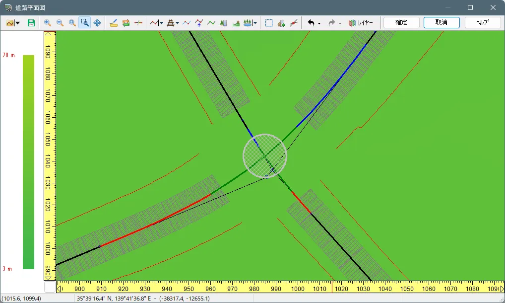メニュー「ホーム」-「編集」の「道路平面図」、または、リボンメニュー「編集」-「シーン」の「道路平面図」で開いた「道路平面図」で見たい範囲を拡大したいとき、マウスのホイールを前に回すとズームアップされます。ホイールを後ろに回すと縮小されます。