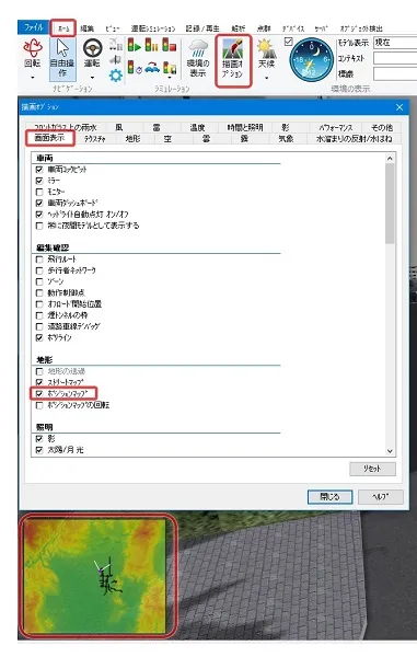 また、「描画オプション」-「画面表示」の「クリッピング」でもチェックを付けると「その他」で指定した標高でのクリッピングが有効となります。