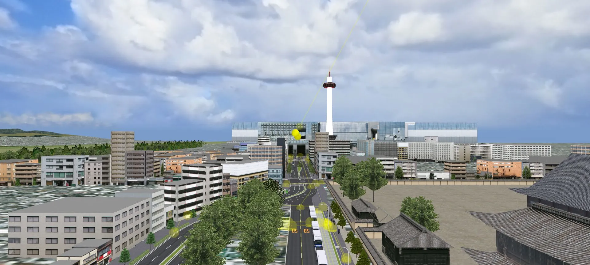 ビルや樹木の上部を一時的にカットして交通流を確認した例