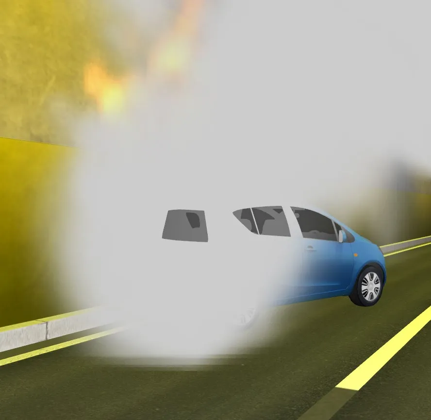 炎と煙は、デフォルトでは「描画オプション」-「気象」の風向きに従います。これをトンネルなどに沿った流れにする場合は「煙トンネル」機能を使用します。
