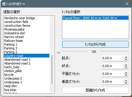 トンネル一覧の「作成」で煙トンネル作成ツールを開き、トンネルがある道路を選択します。表示されたトンネルを選択し、「トンネルから作成」ボタンをクリックします。