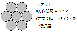 「1本配置」を選択し、コラム間隔にて改良体が接するように調整してください。 千鳥配置の場合は、改良径より小さい間隔を指定できます。 ただし、改良体が重複するような間隔を設定することはできません。