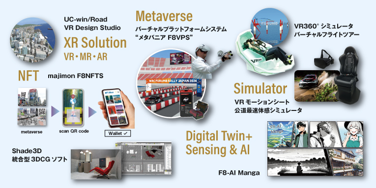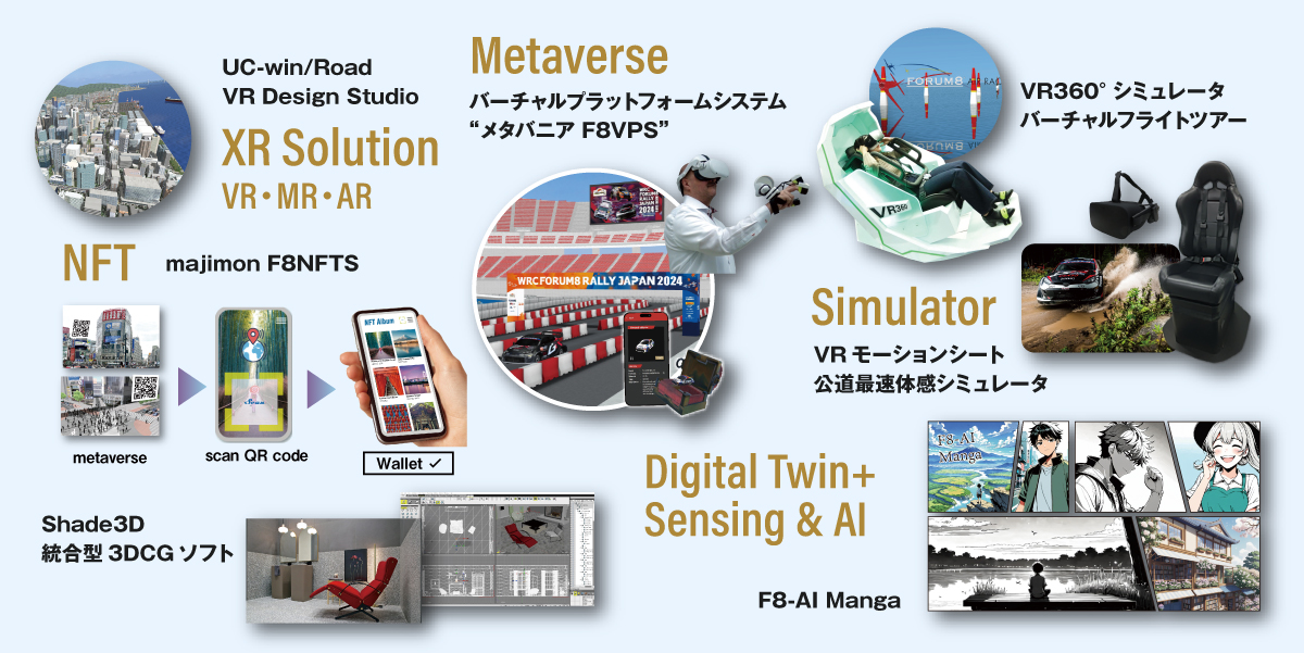 今回は、「デジタルツイン、メタバースを実現する日本発VRCGソフト」をテーマとして出展。多様な3D空間をメタバースとして自由に展開できる「F8VPS」およびこれと連携可能なWeb3システム・NFTサービス「F8NFTS」、メタバース構築ツールとして、大規模デジタルツイン環境を簡単に作成できるVRソフト「UC-win/Road」と3DCGソフト「Shade3D」、AI技術を活用したデザインツール「F8-AI MANGA®」を中心に紹介します。またAR/MRソリューション、ジェスチャによる運転コントロールシステム、360度回転タイプのシミュレータによるエアレース等、各種シミュレータシステムによる体験を提供いたします。