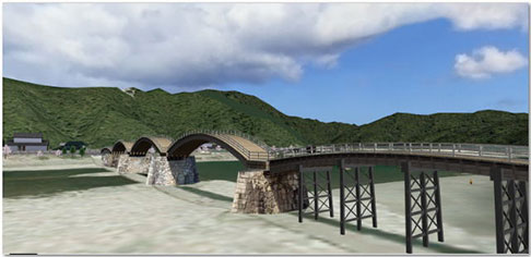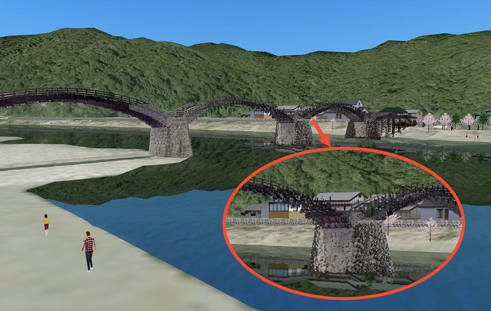 本プログラムは、一般社団法人 岩国青年会議所が主催する創立60周年記念イベントの一環として企画されたもので、錦帯橋における初のプロジェクションマッピングとなります。木造五連のアーチ橋という貴重な歴史的建造物の特徴を活かして、橋脚部に岩国にゆかりのある映像を投影します。企画・製作を一般財団法人 最先端表現技術利用推進協会(表技協)が担当し、フォーラムエイトでは、投影対象・周辺の計測および点群データを活用した3DVRモデリング、投影シミュレーションなど、土木構造物へのプロジェクションマッピングを支援する最新技術で協力しています。