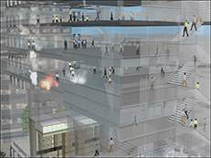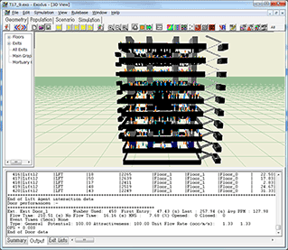 ▲UC-win/Roadによる高層オフィスビル避難解析結果の可視化(エレベータ・エスカレータ使用) |