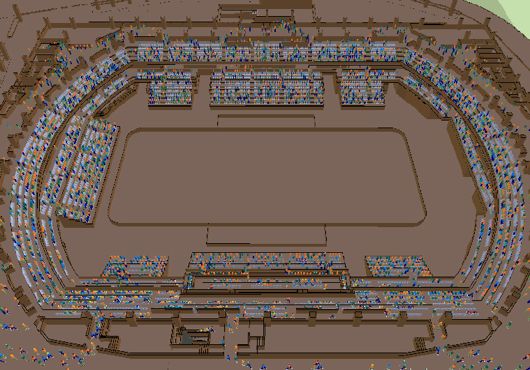 | ▲避難モデル表示例(vrEXODUS):大型多目的アリーナ「ビッグハット」 |
