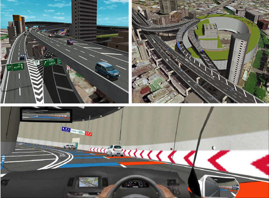 高低差70mに2回転のループ、限られた用地での4枝交差といった複雑な道路構造や、色分けによる誘導等を表現し、ドライブシミュレータによる走行支援策を検討 |