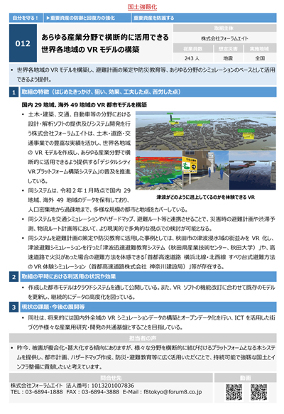 株式会社フォーラムエイト(本社:東京都港区港南2-15-1、社長:伊藤裕二、URL:https://www.forum8.co.jp)は、内閣官房国土強靭化推進室が令和2年4月に刊行した『国土強靭化 民間の取組事例集』に掲載されました。