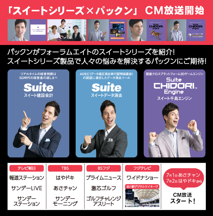 新CMは、7月1日の「あさチャン」(TBS)、7月2日の「はやドキ」(TBS)を皮切りに、フジテレビ、BSフジなど各局で放映されます。パックンがフォーラムエイト製品で人々の様々な悩みを「スイートに解決」するCMにぜひともご期待ください。