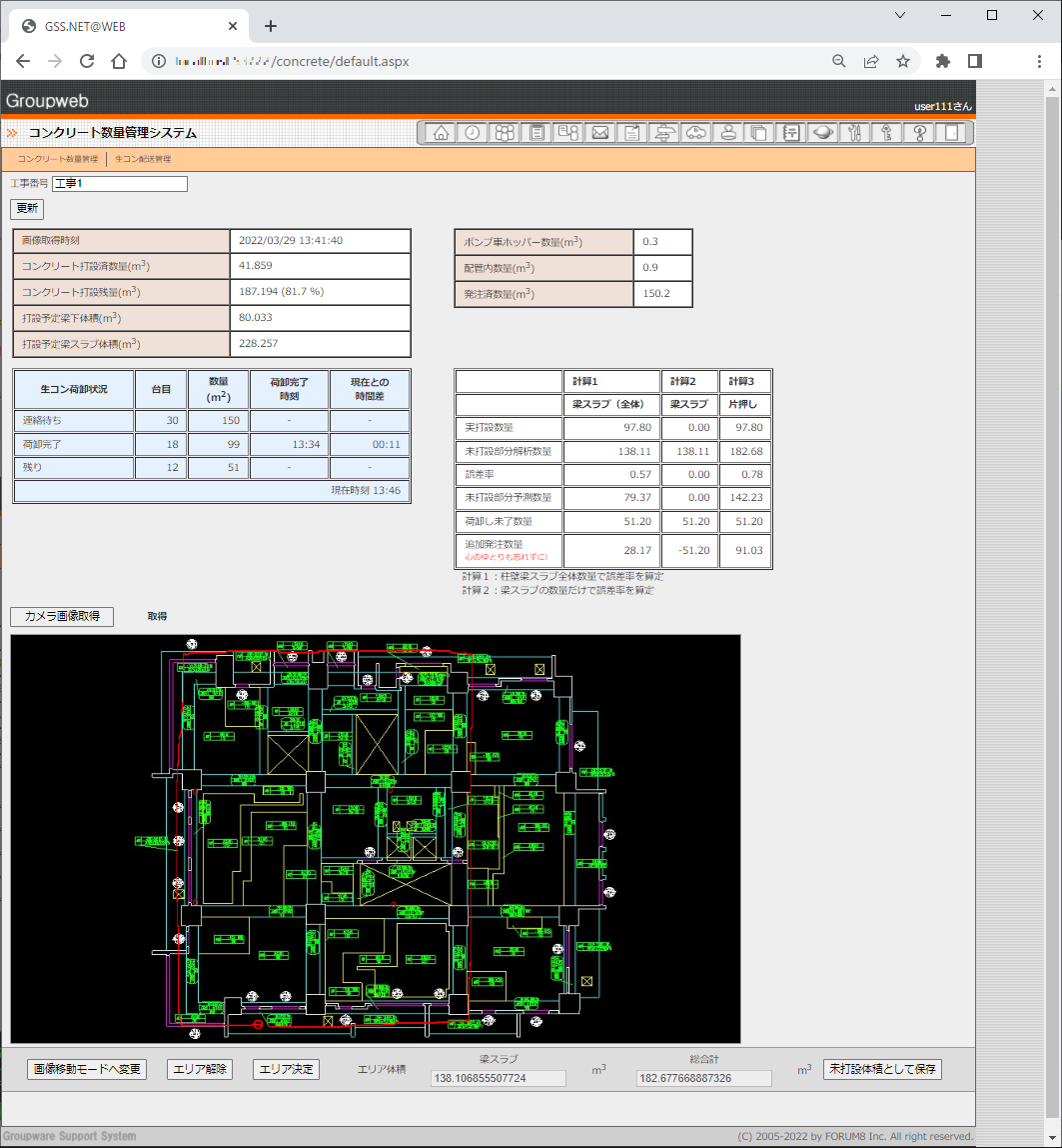 コンクリート打設管理システムは、Web業務システムGSS(グループウェア・サポートシステム)経由で動作するアプリケーションとして、フォーラムエイトより2022年度を目途に販売開始を予定しています。
