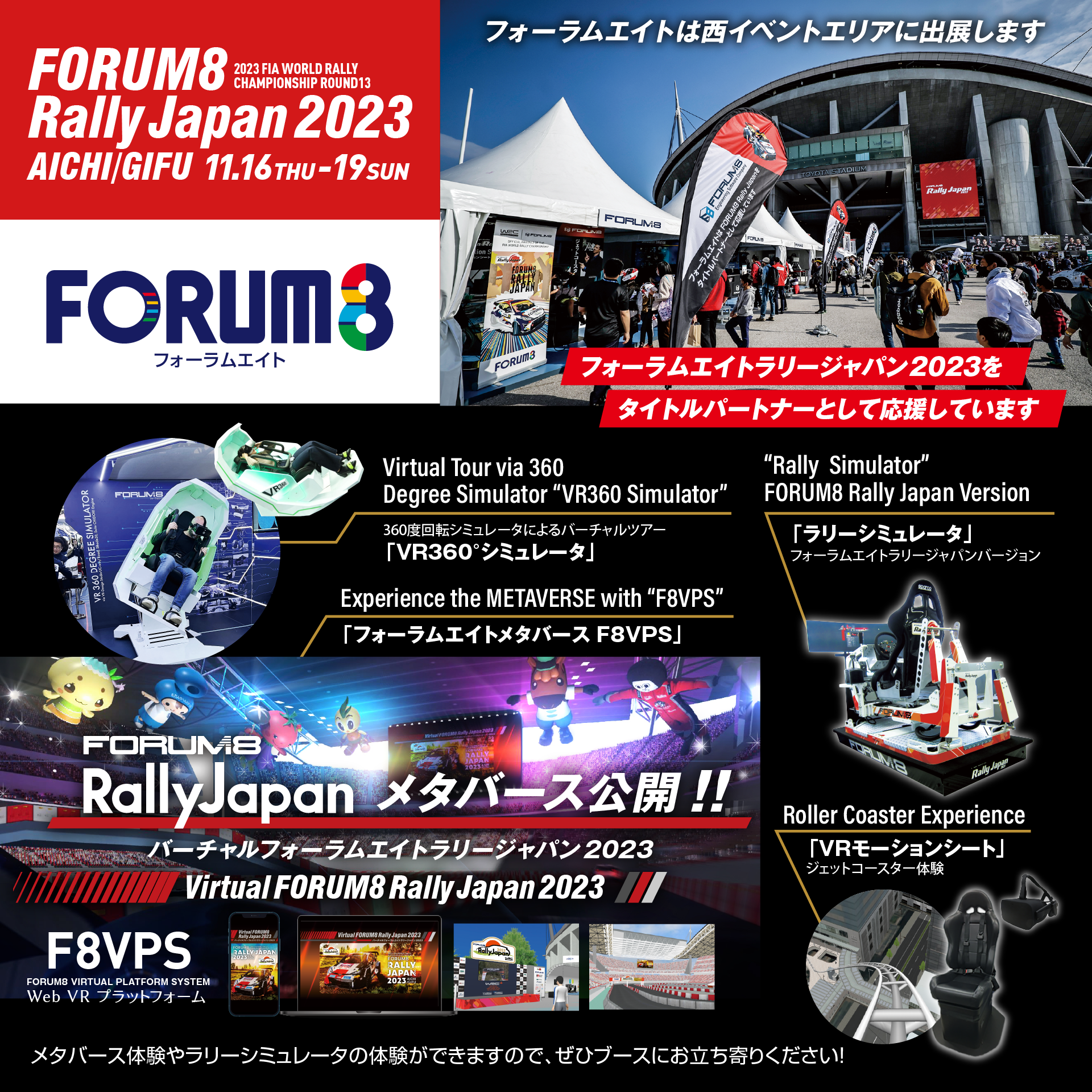 本年の「フォーラムエイト・ラリージャパン2023」は、11月16日(木)~19日(日)に開催されます。フォーラムエイトは会場となる豊田スタジアムのイベントエリアにも出展し、メタバース体験やラリーシミュレータ体験を提供。オフィシャルタイトルパートナーとして大会の盛り上げに貢献いたします。