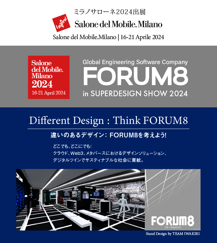 2022年よりWRC世界ラリー選手権「フォーラムエイト・ラリージャパン」のタイトルパートナーを務める株式会社フォーラムエイト(本社:東京都港区港南2-15-1、社長:伊藤裕二、URL:https://www.forum8.co.jp)は、本年4月にイタリア・ミラノで開催される世界最大規模の家具見本市「ミラノ・サローネ」(通称)に3年連続で出展します。同見本市は、近年は家具だけではなく、自動車や先端技術を駆使した実験的な試み、グローバル企業のブランディング、マーケティングの場にもなっており、フォーラムエイトブースでは、「違いのあるデザイン: FORUM8を考えよう!」をテーマとし、成熟した欧州のデザインマーケットに向け、様々な自社技術やその活用例を紹介します。