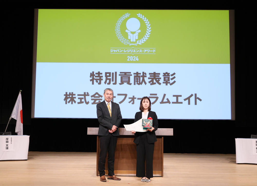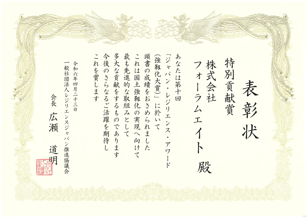 株式会社フォーラムエイト(本社:東京都港区港南2-15-1、社長:伊藤裕二、URL:https://www.forum8.co.jp)は、2024年4月23日、一般財団法人レジリエンスジャパン推進協議会より、これまでの国土強靭化への取り組みについて「ジャパン・レジリエンス・アワード(強靭化大賞)」の「特別貢献賞」を受賞。千代田区・内幸町にて開催された表彰式には、内閣総理大臣、国土強靭化担当大臣が出席いたしました。