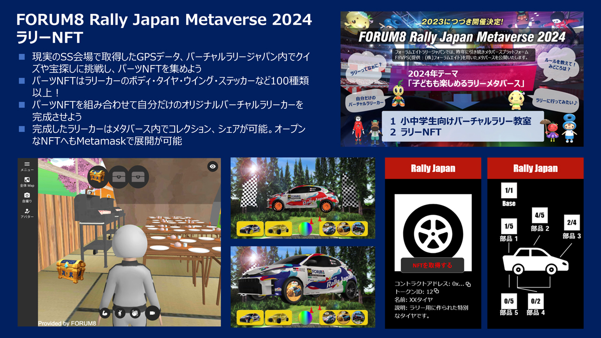このF8NFTSとメタバースを活用したシステムとして、2024年11月に開催されるFORUM8 Rally Japan 2024では「ラリーNFT」を公開いたします。「子どもも楽しめるラリーメタバース」として、クイズや宝探しに挑戦してパーツNFTを集め、自分だけのオリジナルバーチャルラリーカーを完成させるコンテンツを提供し、イベントを盛り上げていきます。