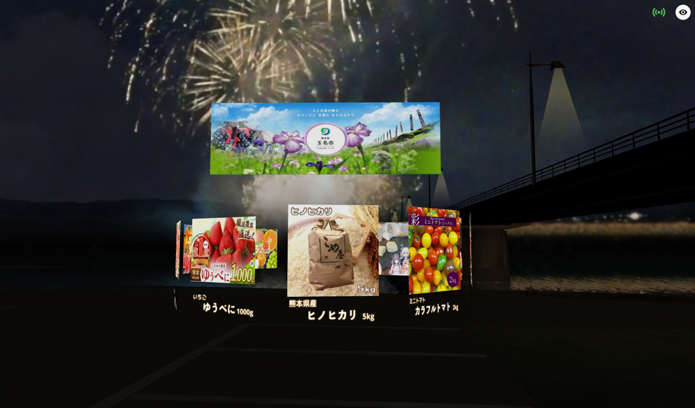 菊池川河川敷では、実際に10月に開催された花火大会をドローンで撮影された360度動画で体験できます。また、花火が打ちあがる河川敷の空間に、果物やお菓子など玉名市の特産品のイメージが表示され、ECサイト、ふるさと納税サイトへのアクセスや、玉名市のイベント情報を閲覧できる交流サイトへのリンクも用意されています。