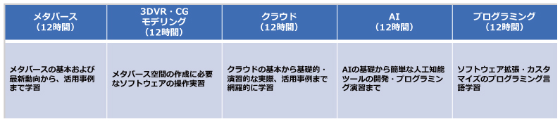 本教育プログラムは、「メタバース」「AI」「ドローン」を三つの軸とし、最新動向の学習や実践的演習を通じて最先端のITスキルを獲得することを目的としています。