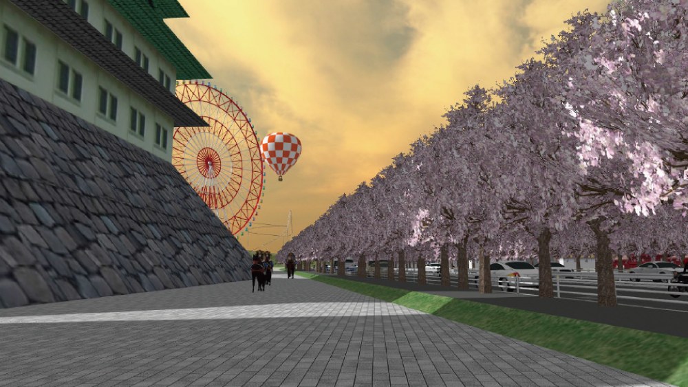 首都を小笠原に!という思いから近未来の島と都市をデザインしています。実際にUC-win/Roadにある日本の地形から小笠原の場所に都市を作ってくれました。トンネルや橋をくぐり抜け、海沿いの道を爽快に走り抜けると都市部のドームが近づいてくる、そのワクワク感が半端ない!アーチをくぐって入る都市構成やビル群の並びもスマートな印象です。