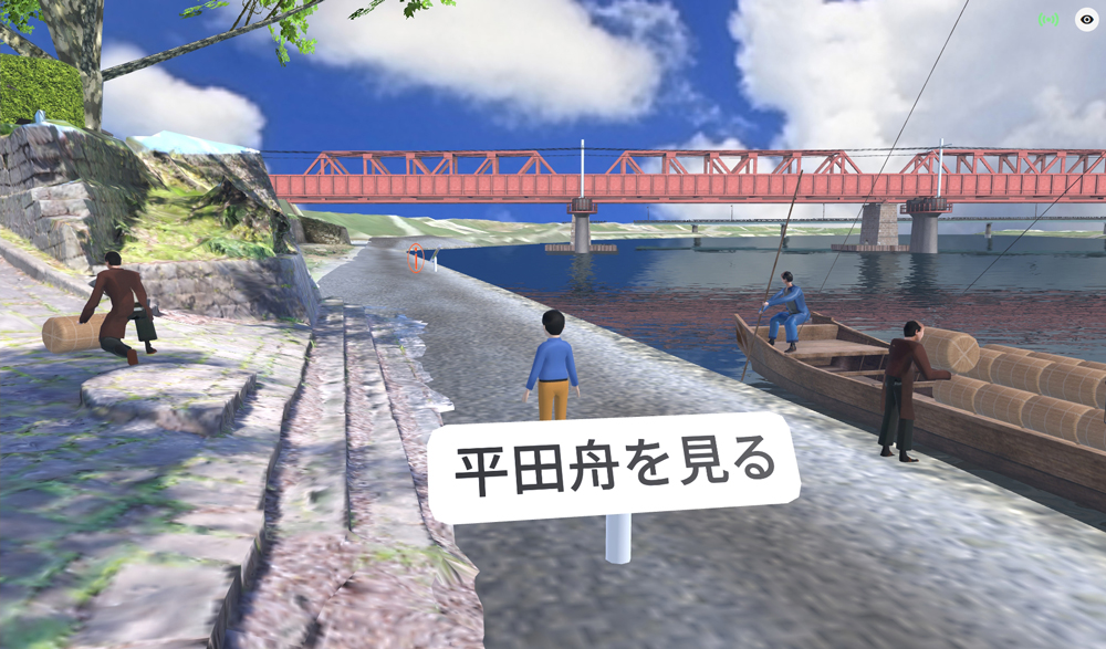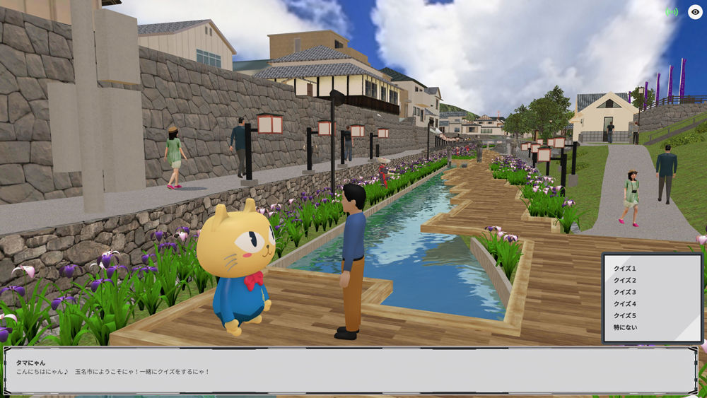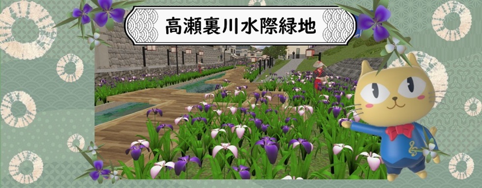 高瀬裏川水際緑地では、有名な花しょうぶ祭りの花摘み娘や夜間ライトアップを表現し、メタバース上で満開の花しょうぶの景観を一年中鑑賞できるようになっており、ゆるキャラとの会話やクイズなども楽しめます。