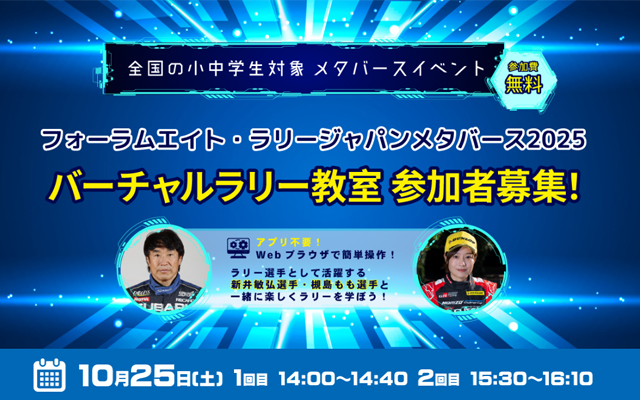 【小中学生向けバーチャルラリー教室|10/25開催】ラリードライバー新井敏弘選手が先生!楽しくラリーや交通安全を学ぶプログラム。