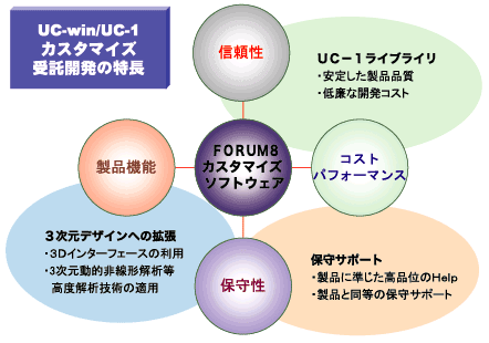 開発したソフトウェアは、UC-1シリーズと同等の保守サポートを提供しており、将来的なアップグレードも十分可能です。また、新工法や新材料などの普及にも、設計ソフトウェアの存在が効果的であることはいうに及びません。開発した製品に対して、販売契約を締結の上、フォーラムエイトの販売ネットワークを利用して一般販売を行うことも可能です。フォーラムエイトでは、様々な設計現場における要求にお応えするべく、スピーディーな受託開発サービスを提供しています。