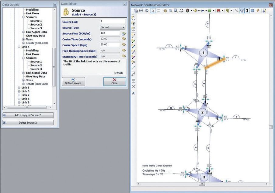 交通流を流体として捉えた街路交通流シミュレーションモデルであり、1967年に開発されています(図2)。交通流を再現する他に信号オフセット、スプリットを最適化する機能も持っています。