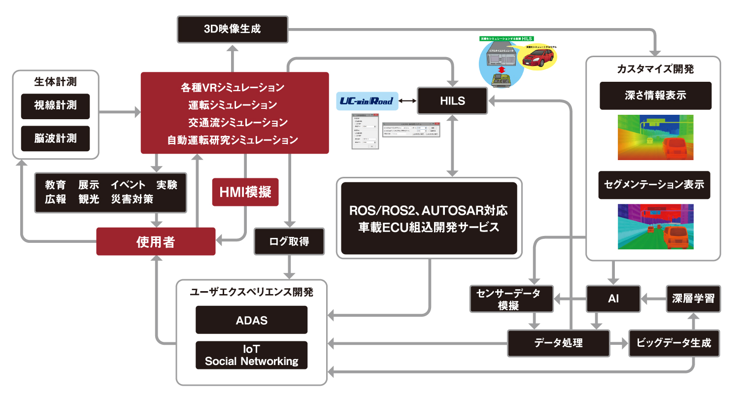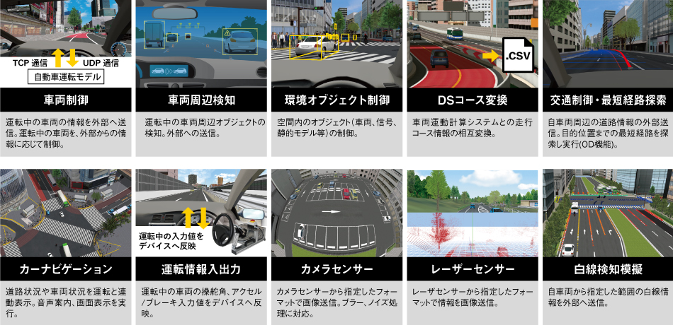 時間、天候、日照・照明、交通流などの環境シミュレーションやシナリオ、ログ、リプレイ機能による実験環境、またAUTOSAR組込開発により、実車と3DVRがリアルタイムに連携する開発環境を実現。