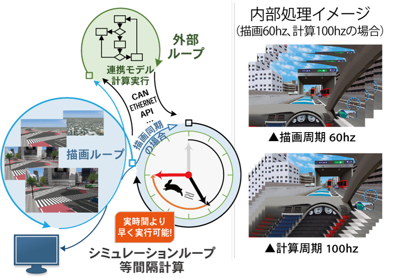 3DVRで走行環境を忠実に再現、現実に発生しうる事象や条件をシナリオ設定して、交通流・群集を生成します HILS/SILSと連携し、各種ハードによる運転シミュレーションをループ制御で検証可能。サードパーティ・システムとの統合にも柔軟に対応