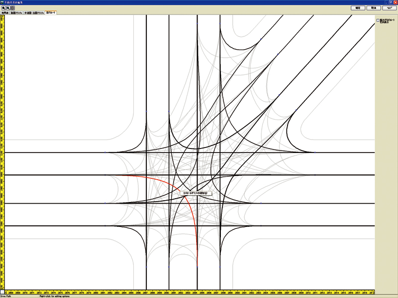 切り土盛り土小段などののり面工の評価などに移動速度に応じた内部景観、外部景観のシミュレーションが行えます。豊富な道路機能により、立体交差、トンネル・橋梁に加えて、平面交差点が簡単に作成でき、複雑な交差点の形状、テクスチャ、走行ルート、交通制御がビジュアルに定義できます。On/Offランプ定義機能により、複雑なインターチェンジも短時間に作成できます。時間交通量、車種別のプロファイル設定により渋滞シミュレーション、バイパス計画による交通量の比較シミュレーションなどにも活用できます。