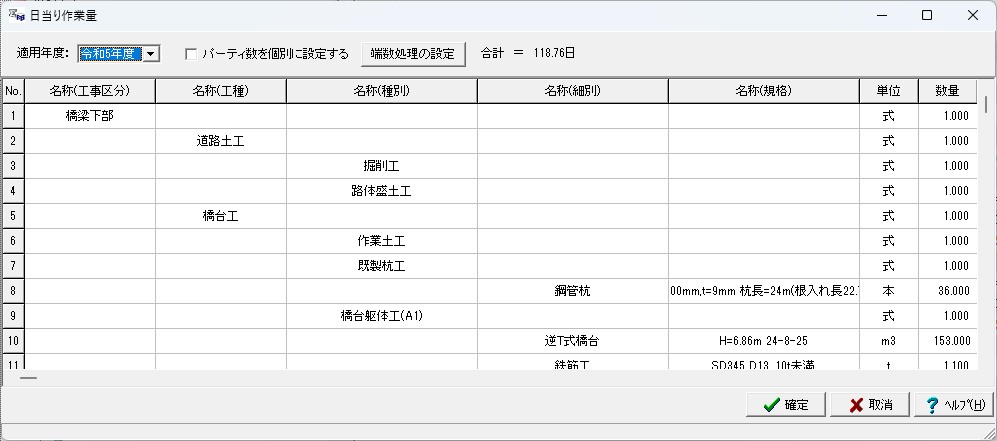 「令和7年度作業日当り標準作業量」及び「国土交通省土木工事標準積算基準書」(赤本)に規定される日当り作業量の算定に対応しています。入力画面および総括表出力時に、歩掛に基づいた日当り作業量及び該当工種における作業日数を表示・出力します。
