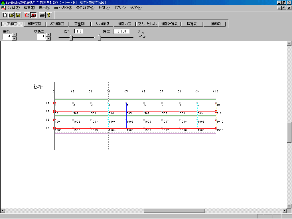 | 橋、桁タイプ | 直線桁、曲線桁、バチ桁、スキュ一付き桁に対応、非整形格子を含む枝桁に対応 支間ごとに桁タイプ、 格子形状を設定可能 |