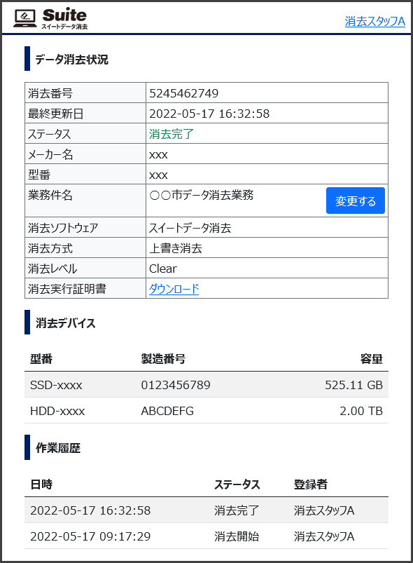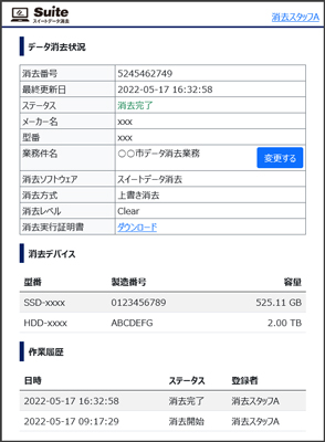 例えば、特定業務の消去履歴のみ許可したゲストアカウントを発行することで、データ消去の依頼者と消去状況を共有するといったことが可能です。