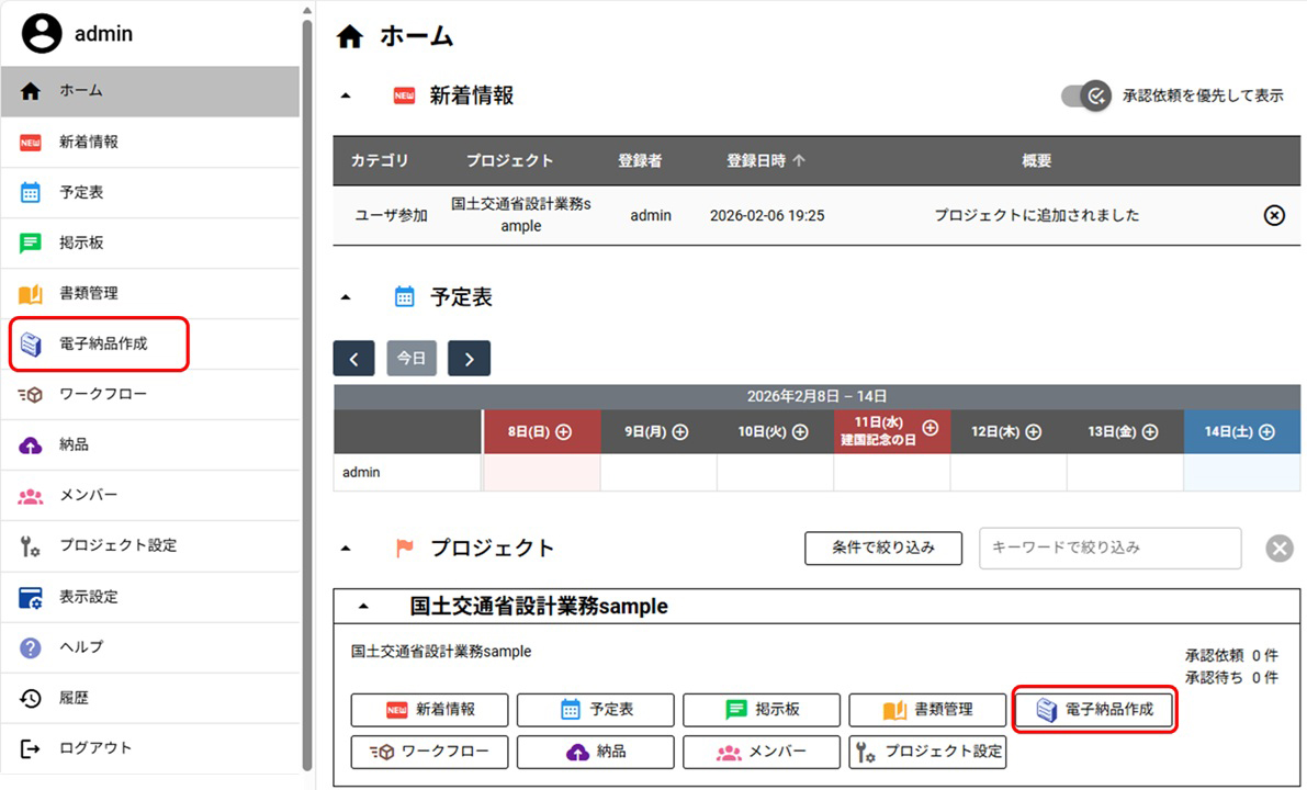 ▲「電子納品オンライン(情報共有システム)」ホーム画面